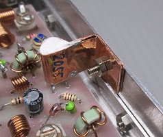 0.2mmの銅板を幅10mmに切り出し、終段の2SC2055に巻きつけ、合わせ面を半田付けし、隙間には放熱用のシリコングリスを充填しておきます。終段電流は最大80mAなので放熱器なしでも大丈夫とは思いますが、安全のためつけておきました。放熱器には「2055」と書いて終段の石に何を使っているか判るようにしておきます。