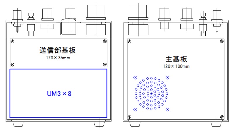 単3×8本の電池ホルダーは長さが120mmであり、これを基準にして各パーツの配置や基板の大きさを決めて、そこに回路が収納できるようにします。
