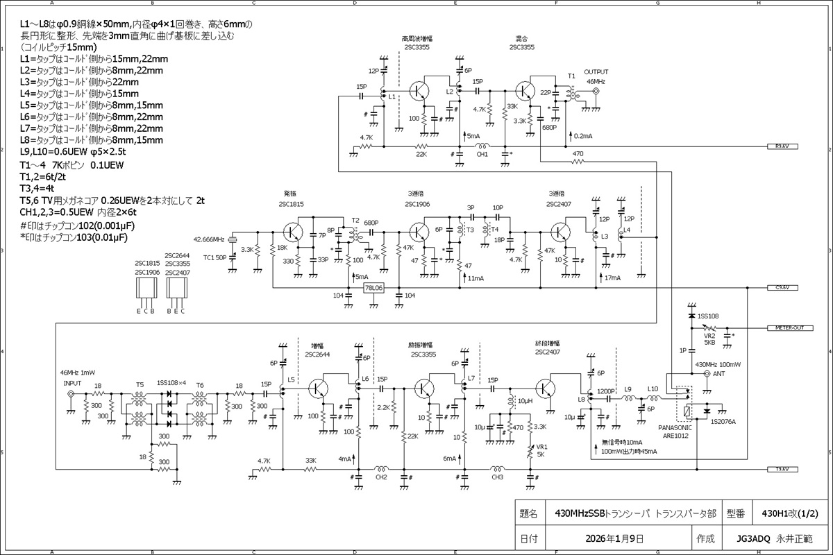 DBM後の増幅を2SK125パラから2SC2644(fT=4GHz)に変更しました。