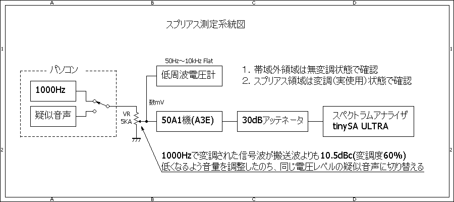 スプリアス領域における測定方法は、「正弦波1kHzで変調度60%(変調時のスペアナで見られる搬送波から-10,5dBc)に設定後、同じレベルの疑似音声に切り替える」とのことです。