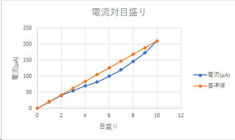 手持部品の中に大阪日本橋のデジットにて400〜500円で買ったSWRメータがありました。窓のサイズは横42mm×縦24mmと比較的大きく、フルスケールは210μAです。これに10等分の目盛りを貼って直線性を調べたところ、基準線に対し少し離れていることが分かりました。