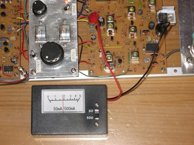 私が作るトランシーバーは出力100mW~2W程度なので、終段電流は500mA以内に収まるため、50mAレンジでは無信号時のバイアス電流、500mAレンジでは最大信号時の電流を画像のような感じで測定しています。