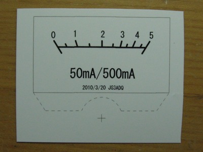 目盛りは自作しました。上記回路を組み、実際に電流を流しながら針の位置を記録し、メータの寸法に合わせCADで図形を書いた後、インクジェットプリンタで厚手のフォトペーパーに印刷し、はさみで切ってから両面テープでメータに貼り付けました。