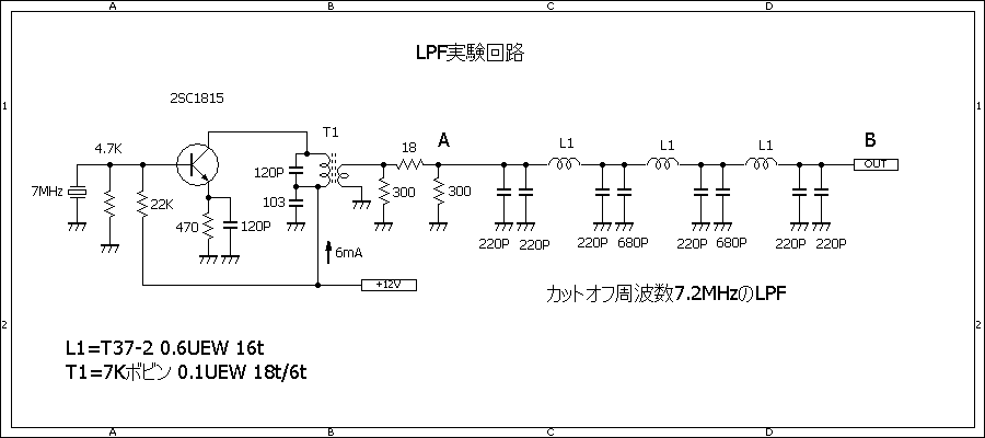 7MHzの水晶発振器を組み、出力部にはインピーダンスの整合を取るため-3dBのアッテネータを入れます。