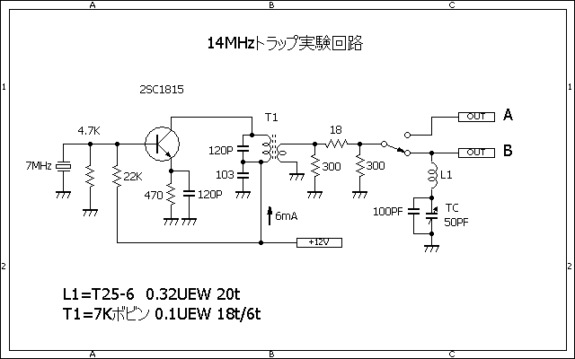 7MHzの水晶発振回路を組み、出力部にはインピーダンスの整合を取るため-3dBのアッテネータを入れます。